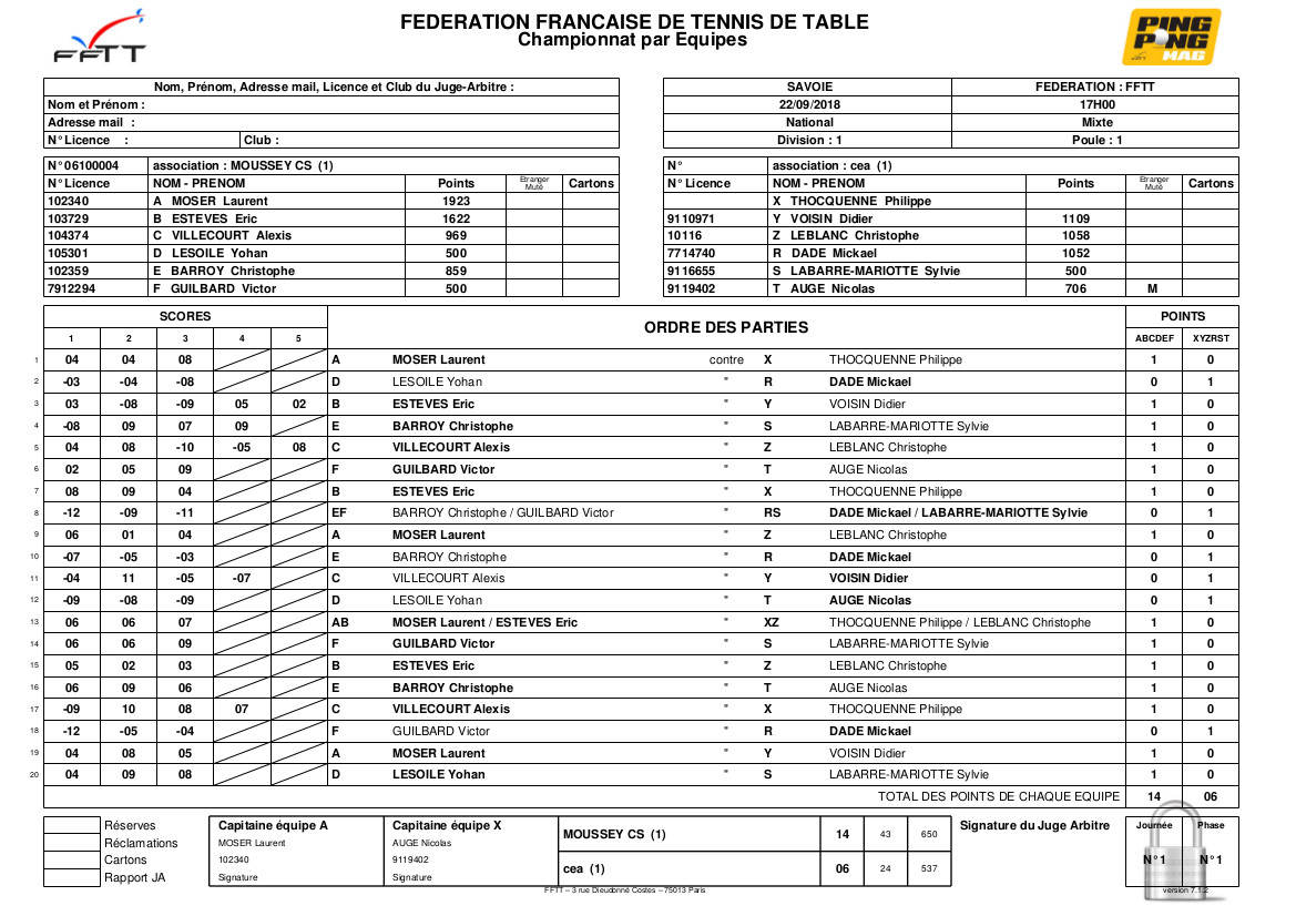 C'est dans une ambiance très sympathique que s'est déroulé la rencontre entre mes deux clubs fétiches. La formation 1 composée de Laurent, Eric et Alexis n'a laissé aucune chance aux Saclaisiens Philippe Didier et Chistophe L (que Moussey a prêté à Saclay) en infligeant un terrible 9-1, c'est Alexis qui s'est incliné contre Didier.